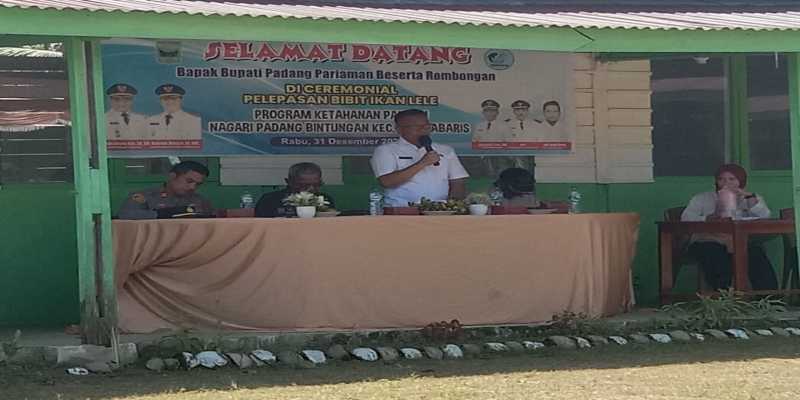 Acara seremonial pelepasan benih ikan lele program ketahanan pangan di nagari padang bintungan kec. nan sabaris di hadari oleh Bupati Padang Pariaman yang diwakili oleh Kepala Dinas Perikanan Kabupaten Padang Pariaman Bapak (Khairul Nizam, S.Pi.M.M), Wakil DPRD Kabupaten Padang Pariaman, Camat Nan Sabaris, dan Kapolsek Nan Sabaris